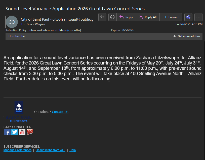 The City of Saint Paul is holding a public hearing on a request for a sound level variance related to the Great Lawn Concert Series at Allianz Field. The request, submitted by Zacharia Litzelswope, seeks permission to permit amplified sound at levels of 97 dBA at 50 feet from the source during events scheduled for specific Fridays from May to September 2026. This variance is necessary as it exceeds the noise limitations established in the St. Paul Noise Ordinance. Affected parties include nearby property owners and renters, who must be informed of the variance request. The Department of Safety and Inspections recommends measures to monitor sound levels and ensure compliance. The public can participate by submitting comments or attending the hearing on March 18, 202